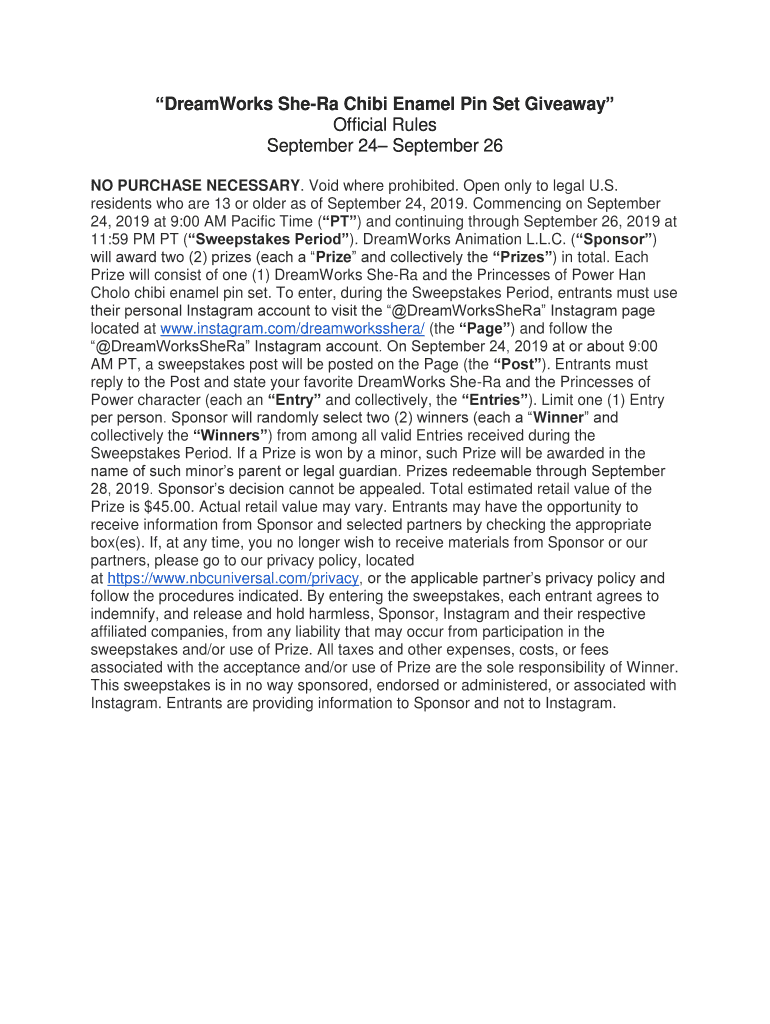 NO PURCHASE NECESSARY. Void where prohibited. Open only to legal U.S.