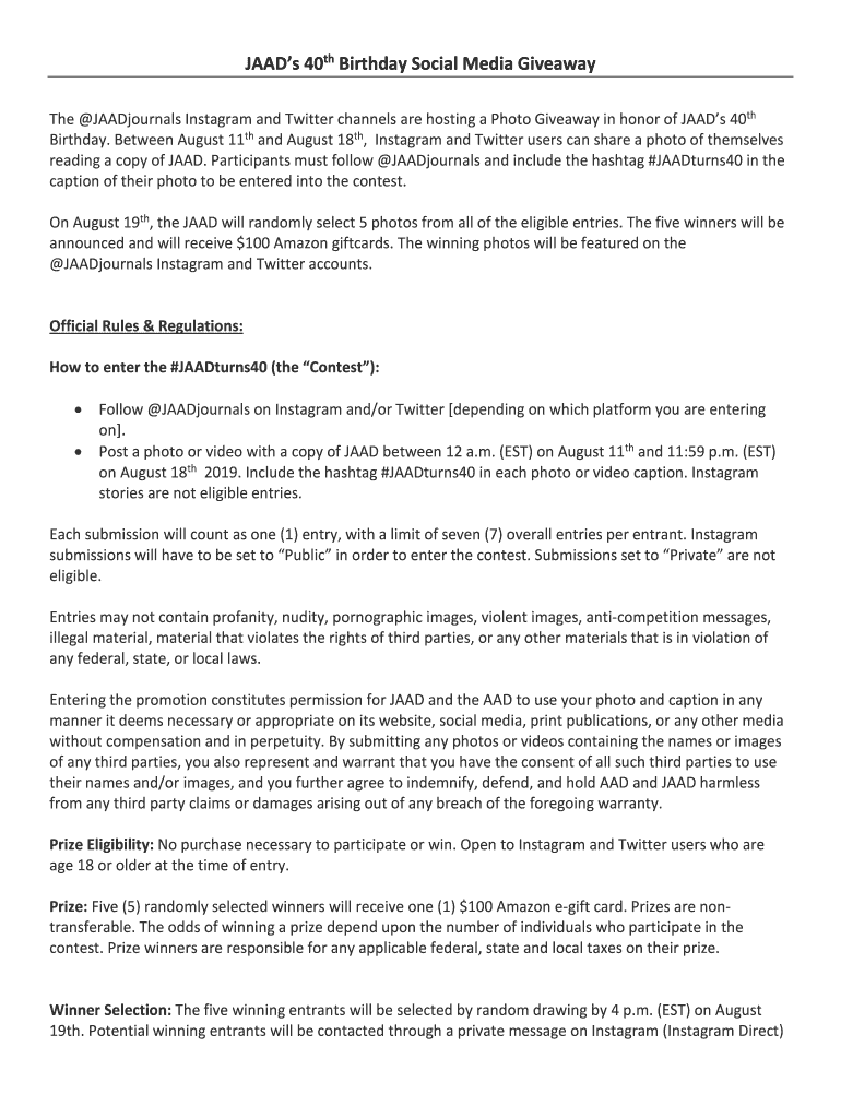 James 40th Birthday Social Media Giveaway The JAADjournals Instagram and Twitter channels are hosting a Photo Giveaway in honor of James 40th Birthday. Between August 11th and August 18th, Instagram
