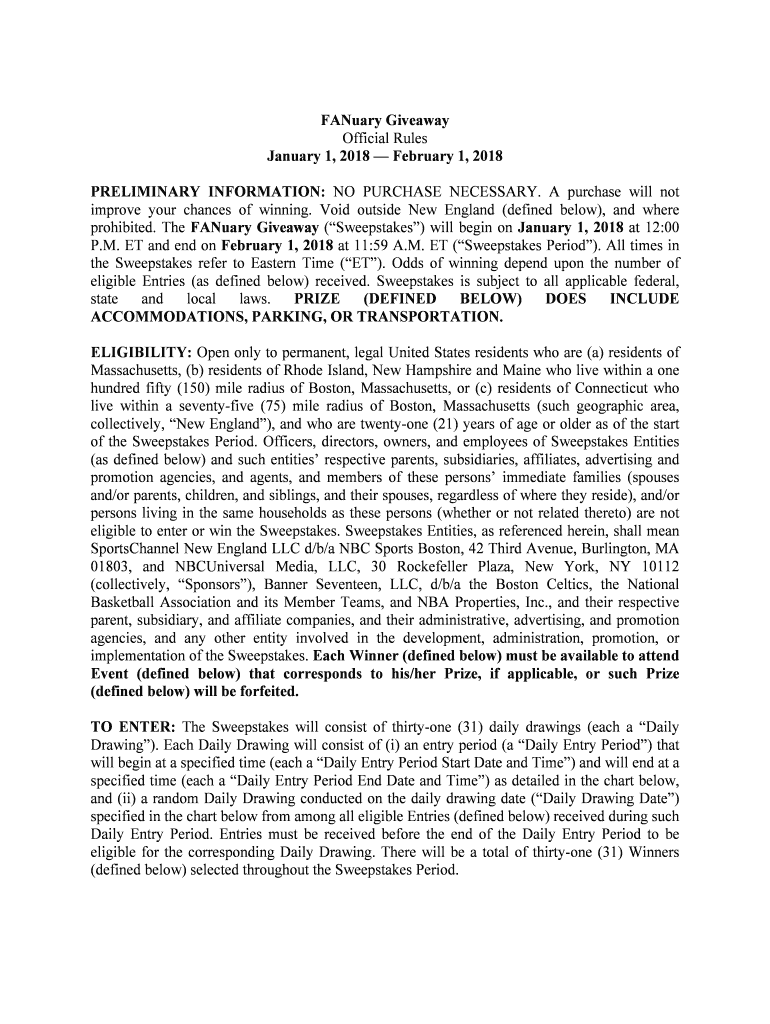 January Giveaway Official Rules January 1, 2018, February 1, 2018, PRELIMINARY INFORMATION: NO PURCHASE NECESSARY. A purchase will not improve your chances of winning. Void outside New England (defined