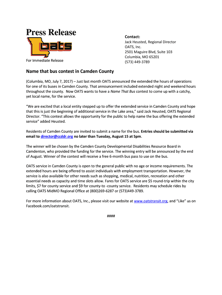 Press ReleaseContact: Jack Heisted, Regional Director OATS, Inc. 2501 Maguire Blvd, Suite 103 Columbia, MO 65201 (573) 4493789For Immediate ReleaseName that bus contest in Camden County (Columbia,