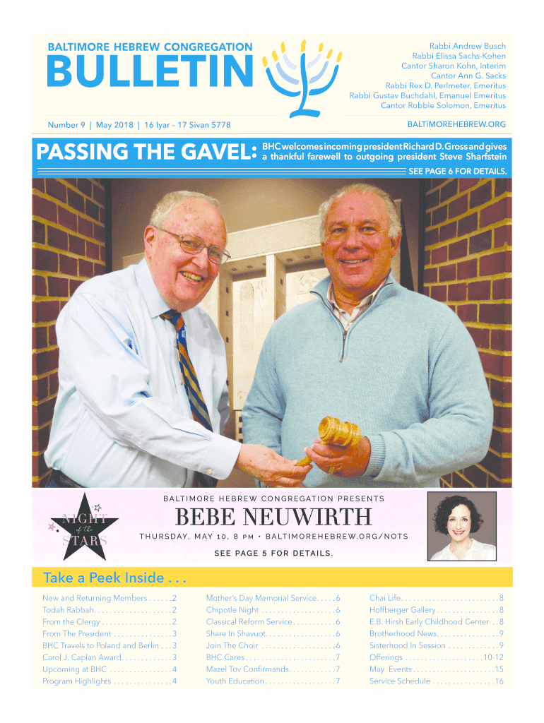 BULLETIN BALTIMORE HEBREW CONGREGATIONRabbi Andrew Busch Rabbi Elissa SachsKohen Cantor Sharon Kohn, Interim Cantor Ann G. Sacks Rabbi Rex D. Perimeter, Emeritus Rabbi Gustav Buchwald, Emanuel Emeritus