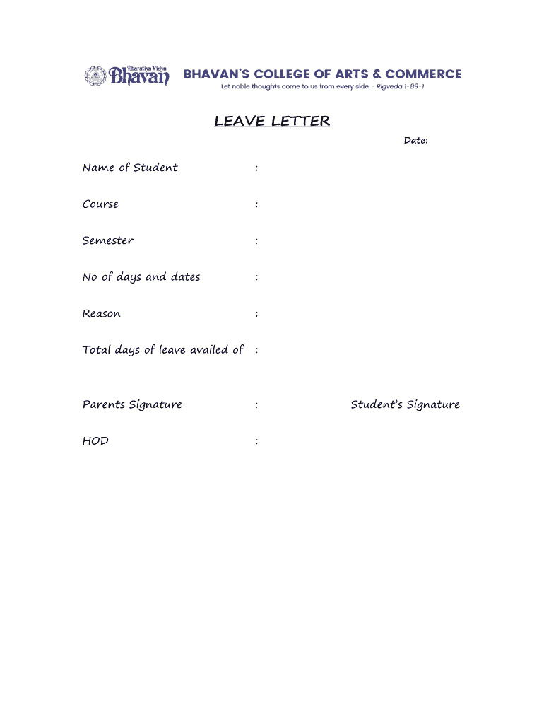 Name of Student:Course:Semester:No of days and dates:Reason:Total days of leave availed of:Parents Signature:HOD:Date:Students Signature