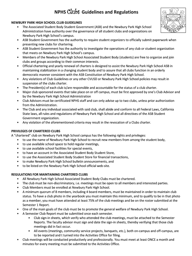 NHS Clubs Guidelines and Regulations NEWBURY PARK HIGH SCHOOL CLUB GUIDELINES The Associated Student Body Student Government (ASB) and the Newbury Park High School Administration have authority over
