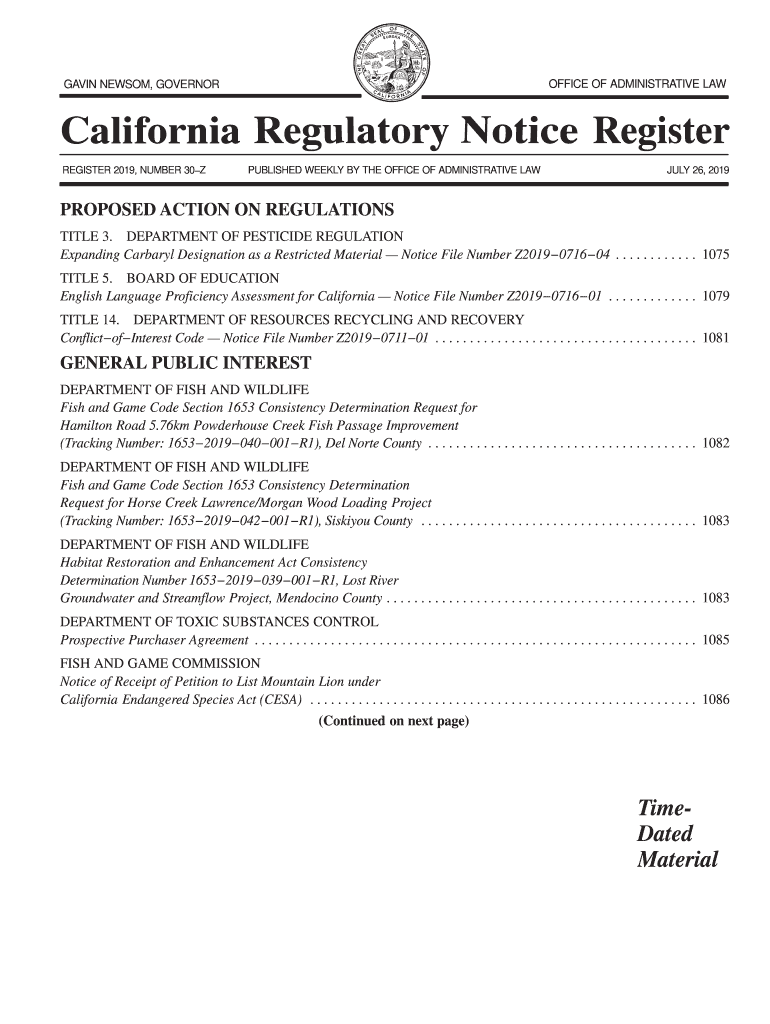 OFFICE OF ADMINISTRATIVE AGAIN NEWSOM, GOVERNORREGISTER 2019, NUMBER 30ZPUBLISHED WEEKLY BY THE OFFICE OF ADMINISTRATIVE LAWFUL 26, 2019PROPOSED ACTION ON REGULATIONS TITLE 3. DEPARTMENT OF PESTICIDE