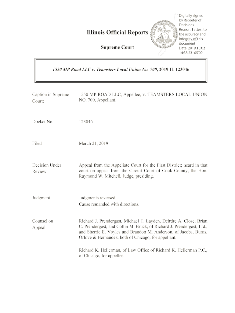 Get the free 1550 MP Road LLC v. Teamsters Local Union No. 700, 2019 IL 123046