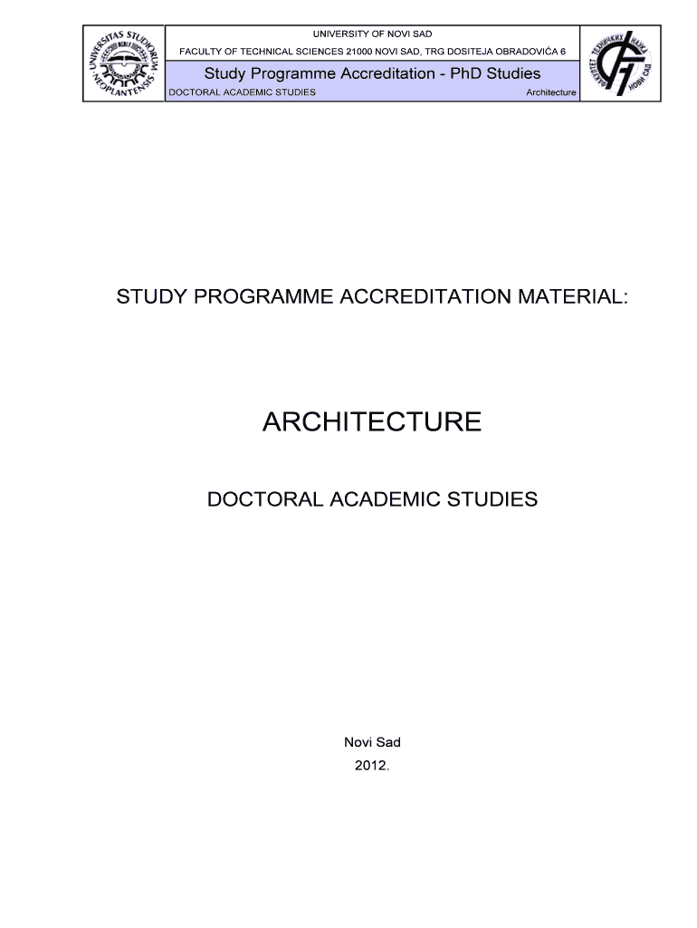 UNIVERSITY OF NOVA SAD FACULTY OF TECHNICAL SCIENCES 21000 NOVA SAD, TRY POSITED OBRADOR 6Study Program Accreditation PhD Studies DOCTORAL ACADEMIC STUDIESArchitectureSTUDY Program ACCREDITATION MATERIAL:ARCHITECTURE