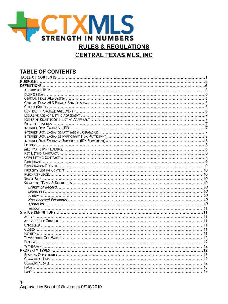 RULES & REGULATIONS CENTRAL TEXAS MLS, INC TABLE OF CONTENTS TABLE OF CONTENTS ............................................................................................................1 PURPOSE