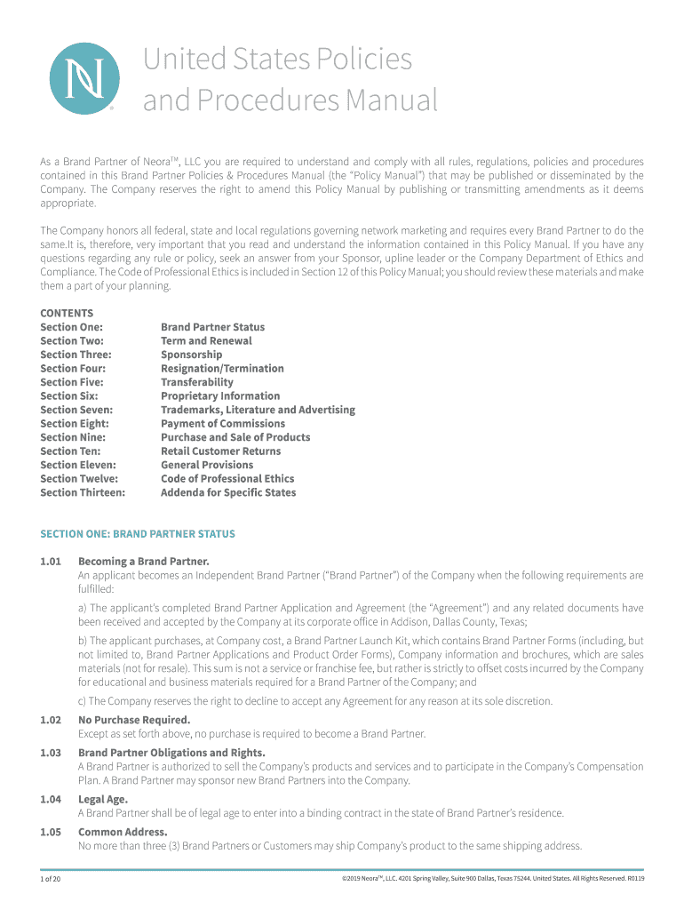 United States Policies and Procedures Manual As a Brand Partner of Neonate, LLC you are required to understand and comply with all rules, regulations, policies and procedures contained in this Brand