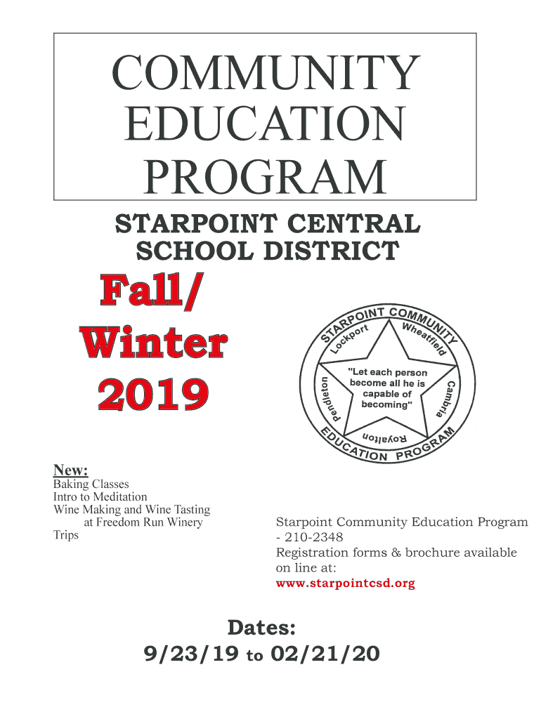 COMMUNITY EDUCATION PROGRAM STANDPOINT CENTRAL SCHOOL DISTRICTFall/ Winter 2019 New:Baking Classes Intro to Meditation Wine Making and Wine Tasting at Freedom Run Winery TripsStarpoint Community Education