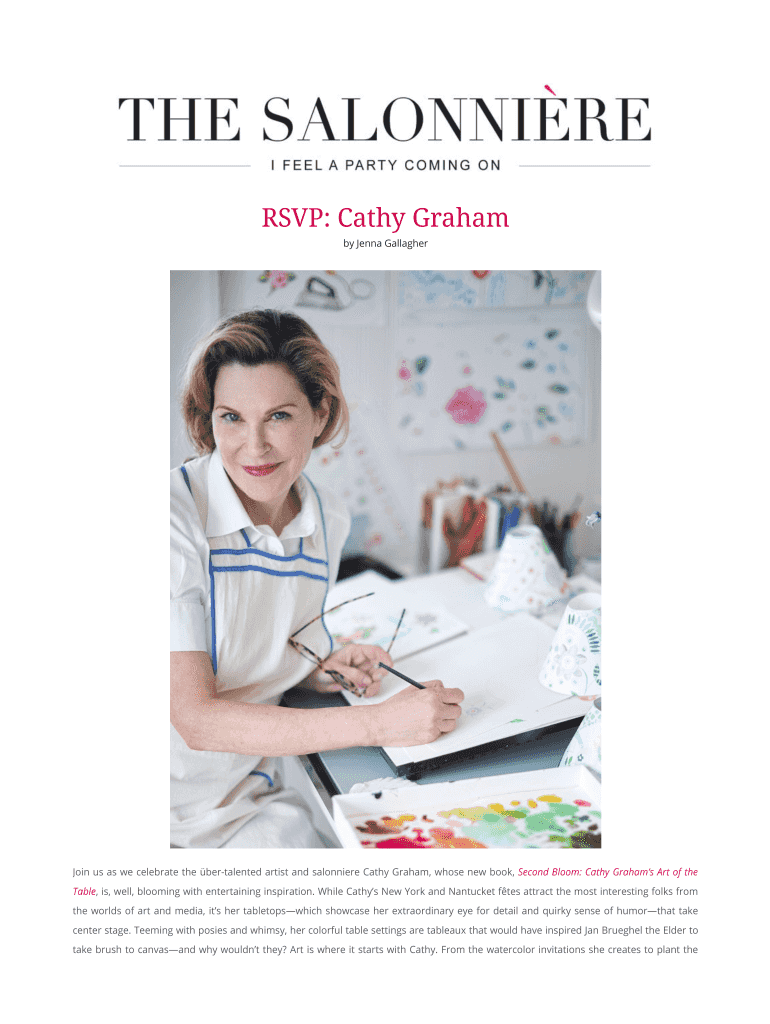 by Jenna GallagherJoin us as we celebrate the talented artist and mayonnaise Cathy Graham, whose new book, Second Bloom: Cathy Grahams Art of the