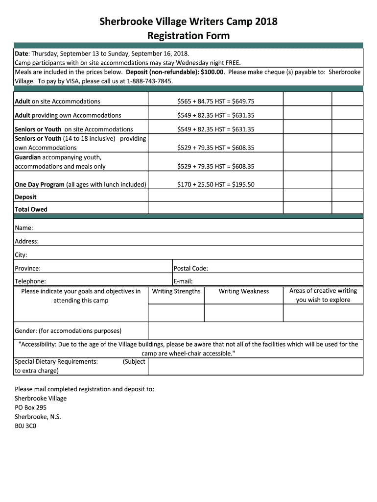 Get the free Sherbrooke Village Writers Camp 2018 Registration Form - sherbrookevillage novascotia