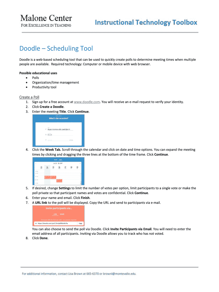 Doodle Scheduling Tool Doodle is a web based scheduling tool that can be used to quickly create polls to determine meeting times when multiple people are available. Required technology: Computer or
