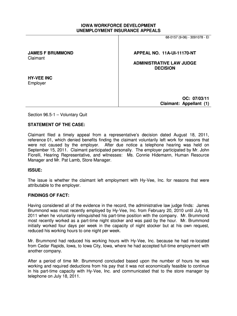 Get the free james f brummond v. hy-vee inc - Iowa Workforce Development