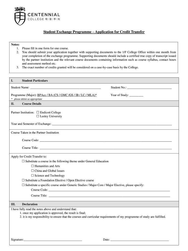 Student Exchange Program Application for Credit Transfer Notes: 1. Please fill in one form for one course. 2. You should submit your application together with supporting documents to the 1/F College
