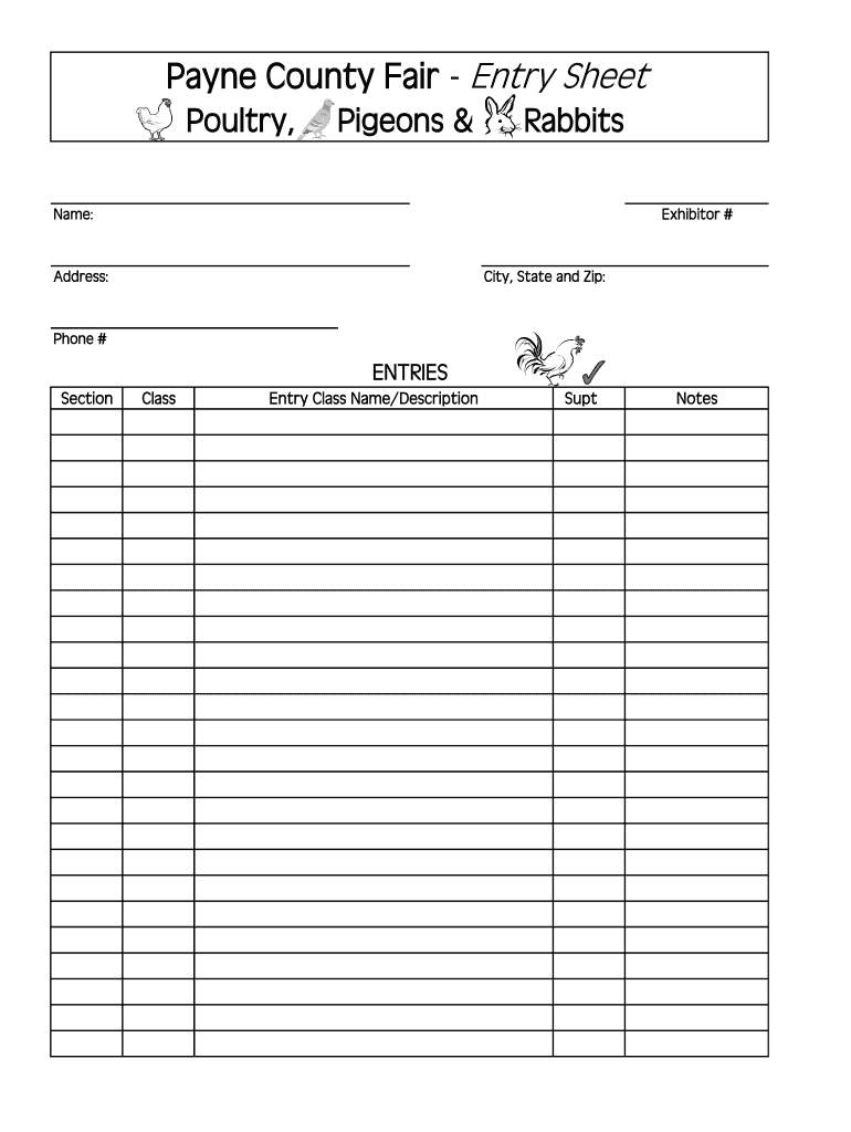Payne County Fair Entry Sheet Poultry, Pigeons &RabbitsName:Exhibitor #Address:City, State and Zip:Phone #ENTRIES SectionClassEntry Class Name/DescriptionSuptNotes