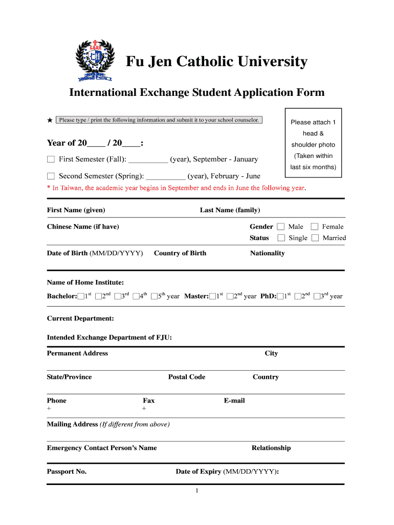 FM Jen Catholic University International Exchange Student Application Form Please type / print the following information and submit it to your school counselor. Please attach 1 head year of 20 / 20