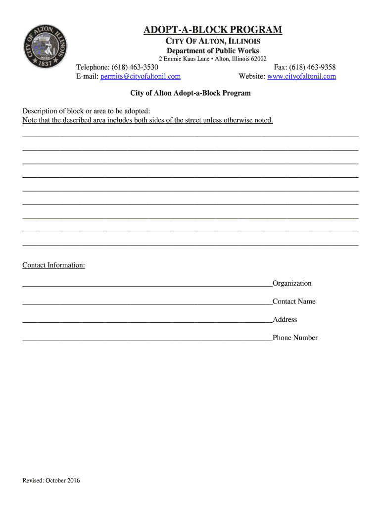 ADOPTABLE PROGRAM CITY OF ALTON, ILLINOIS Department of Public Works 2 Email Klaus Lane Alton, Illinois 62002Telephone: (618) 4633530 Email: permits cityofaltonil. Colfax: (618) 4639358 Website: www.cityofaltonil.comCity