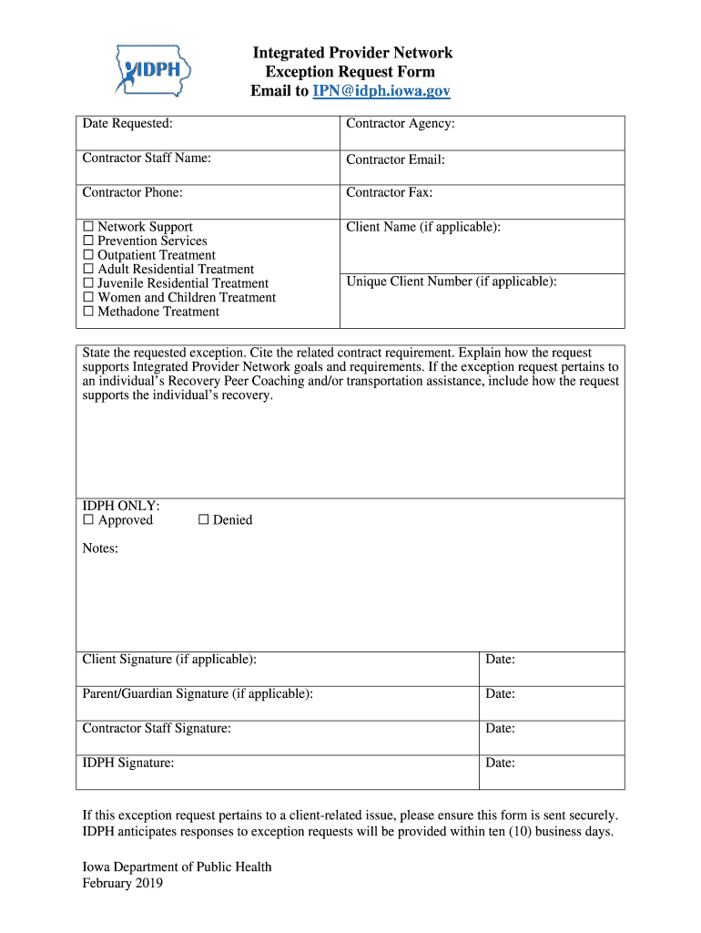 Integrated Provider Network Exception Request Form Email to IPN inf.Iowa.gov Date Requested:Contractor Agency:Contractor Staff Name:Contractor Email:Contractor Phone:Contractor Fax: Network Support