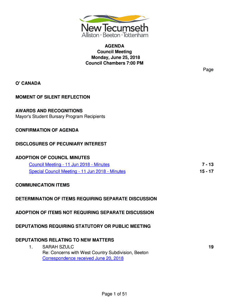 AGENDA Council Meeting Monday, June 25, 2018, Council Chambers 7:00 PM Page O CANADA MOMENT OF SILENT REFLECTION AWARDS AND RECOGNITIONS Mayor's Student Bursary Program Recipients CONFIRMATION OF