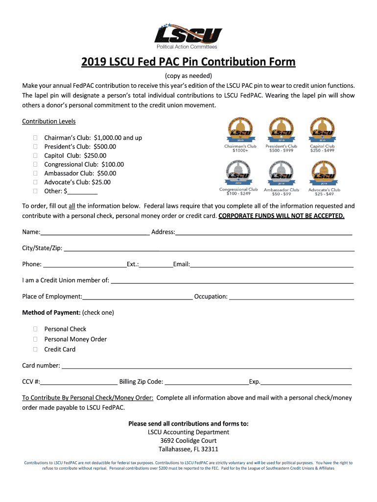 2019 LSC Fed PAC Pin Contribution Form (copy as needed) Make your annual Fed PAC contribution to receive this year's edition of the LSC PAC pin to wear to credit union functions. The lapel pin will