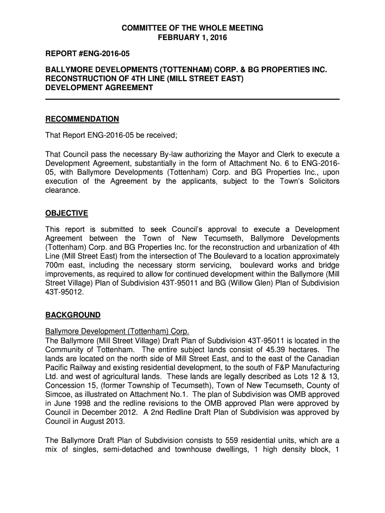 COMMITTEE OF THE WHOLE MEETING FEBRUARY 1, 2016, REPORT #ENG201605 BALTIMORE DEVELOPMENTS (TOTTENHAM) CORP. & BG PROPERTIES INC. RECONSTRUCTION OF 4TH LINE (MILL STREET EAST) DEVELOPMENT AGREEMENTRECOMMENDATION