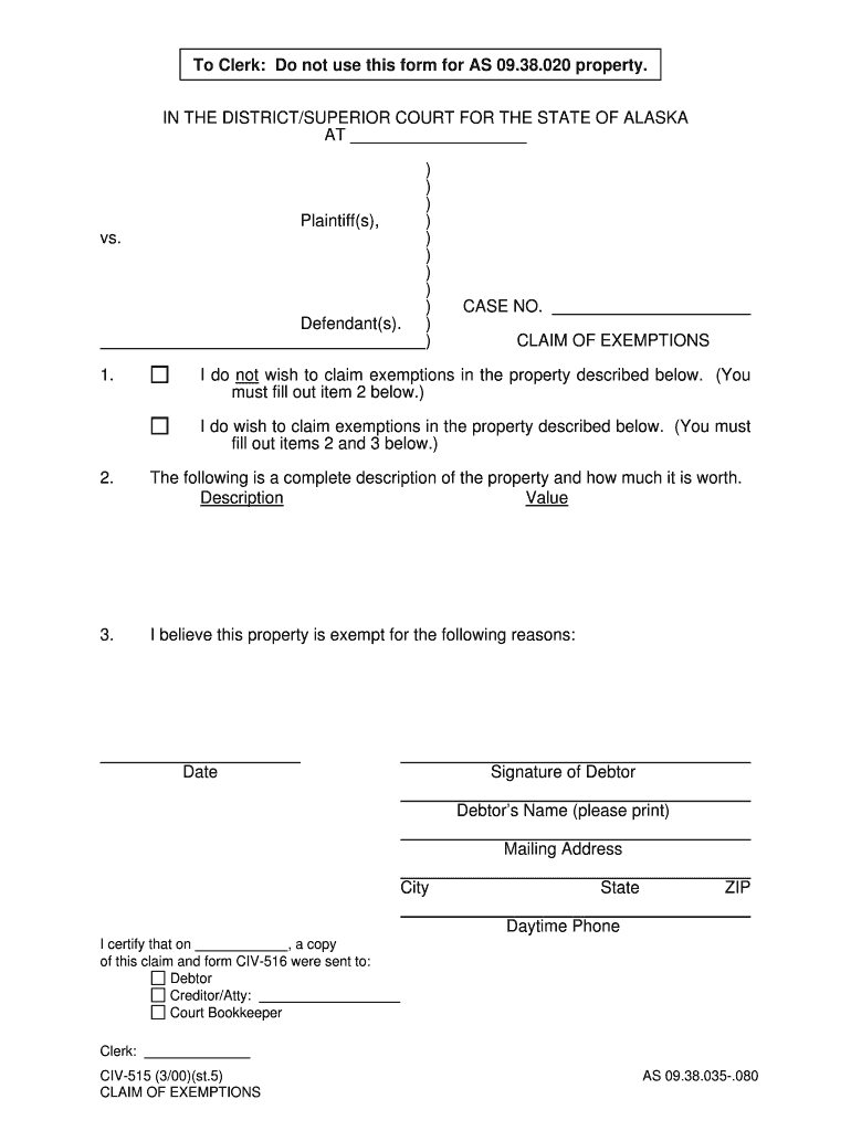 To Clerk: Do not use this form for AS 09.38.020 property. IN THE DISTRICT/SUPERIOR COURT FOR THE STATE OF ALASKA AT Plaintiff(s), vs. Defendant(s). 1.) ))))))))))CASE NO. CLAIM OF EXEMPTIONS do not
