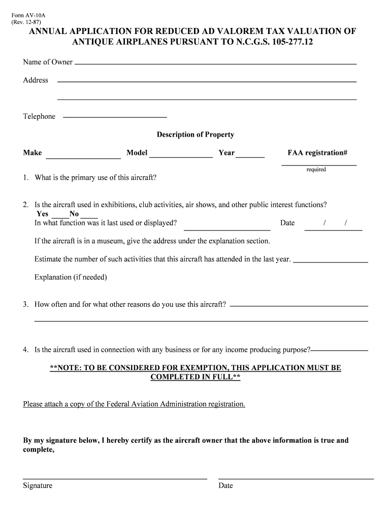 ANTIQUE AIRPLANES PURSUANT TO N.C.G.S. 105277.12