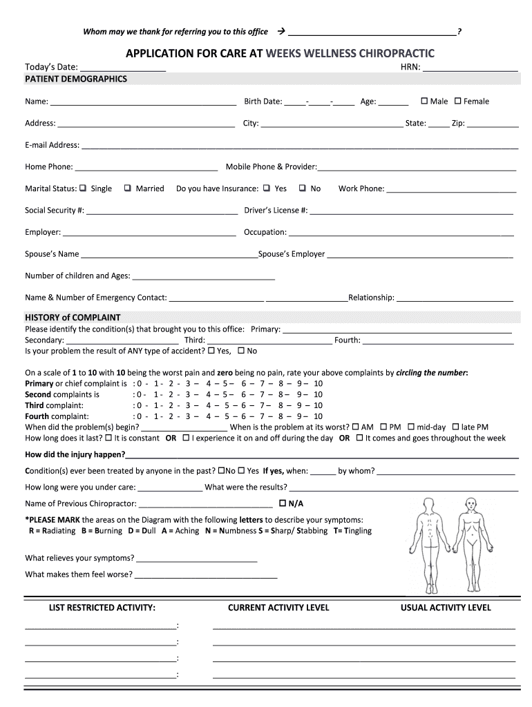Whom may we thank for referring you to this office ?APPLICATION FOR CARE AT WEEKS WELLNESS CHIROPRACTIC Today's Date: PATIENT DEMOGRAPHICS: Name: Birth Date: Age: Male FemaleAddress: City: State: