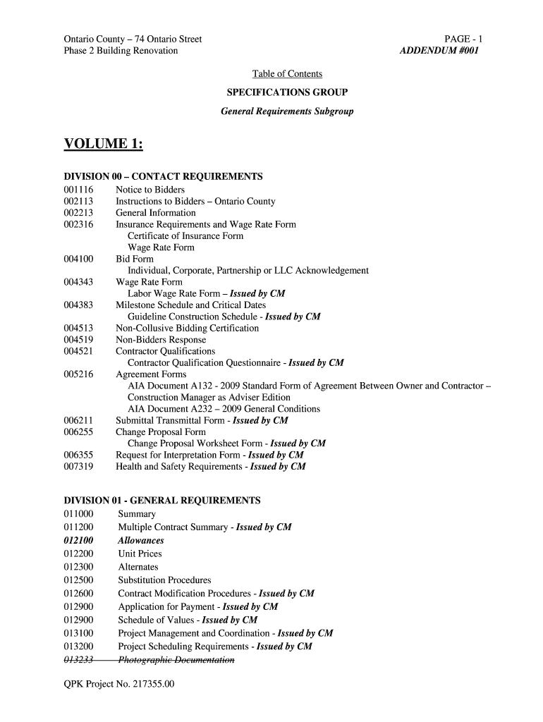 Ontario County 74 Ontario Street Phase 2 Building RenovationPAGE 1 ADDENDUM #001 Tables of Contents SPECIFICATIONS GROUP General Requirements SubgroupVOLUME 1: DIVISION 00 CONTACT REQUIREMENTS 001116