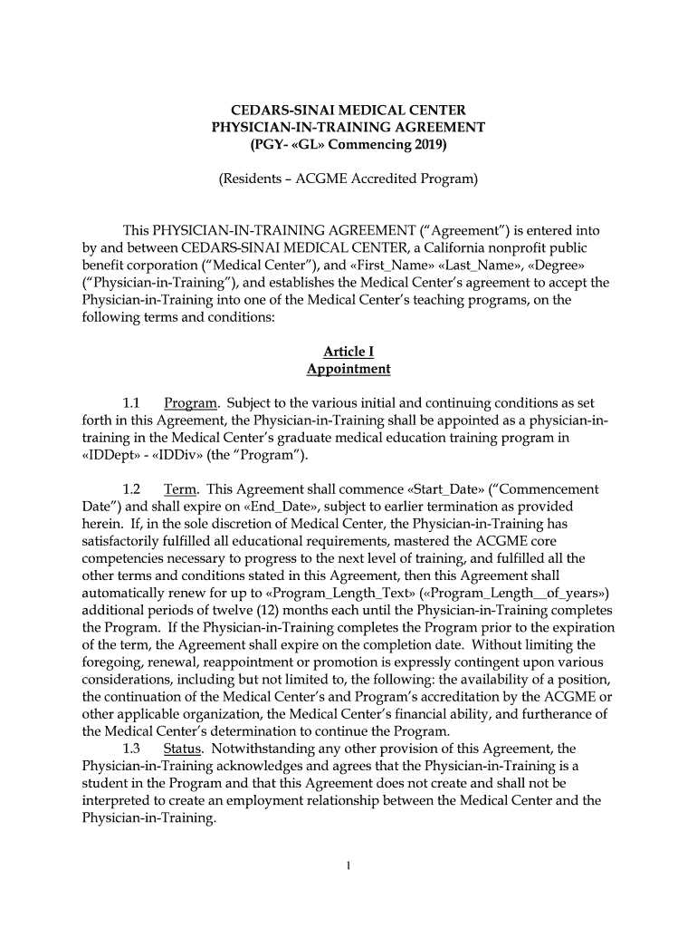 CEDARSSINAI MEDICAL CENTER PHYSICIANINTRAINING AGREEMENT (PAY GL Commencing 2019) (Residents ACME Accredited Program) This PHYSICIANINTRAINING AGREEMENT (Agreement) is entered into by and between