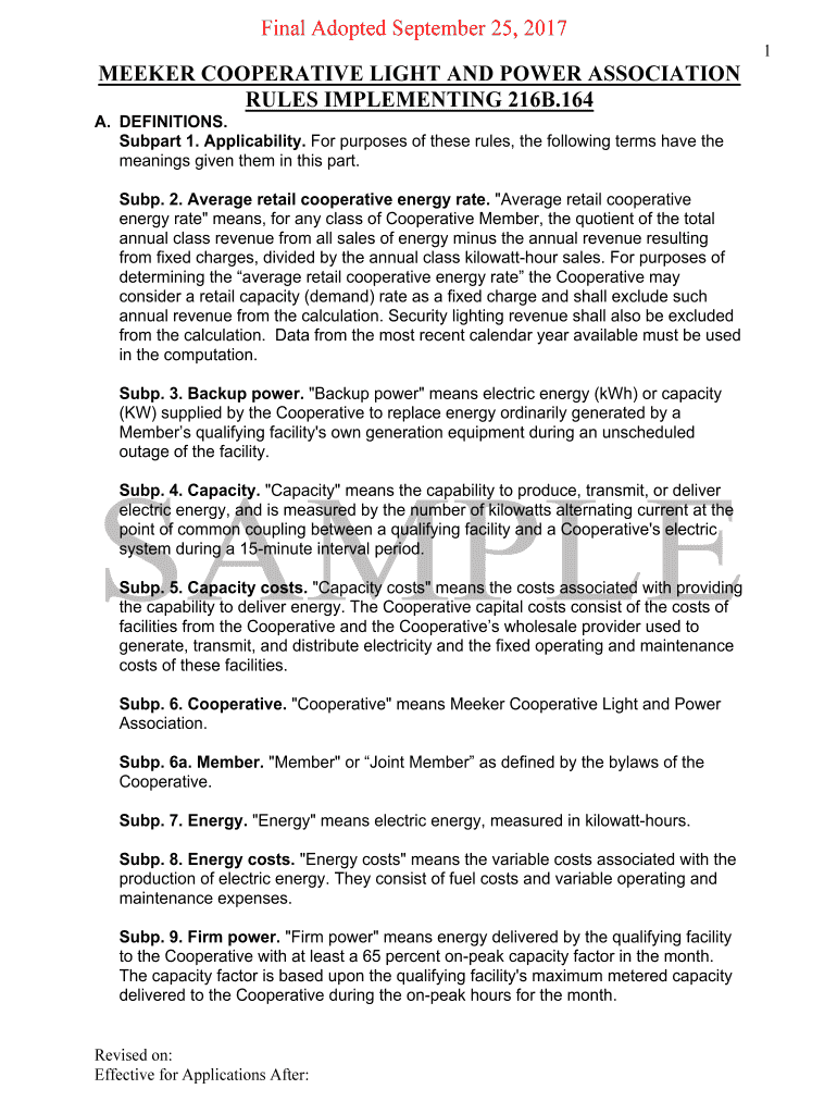 Final Adopted September 25, 2017 1MEEKER COOPERATIVE LIGHT AND POWER ASSOCIATION RULES IMPLEMENTING 216B.164 A. DEFINITIONS. Subpart 1. Applicability. For purposes of these rules, the following terms