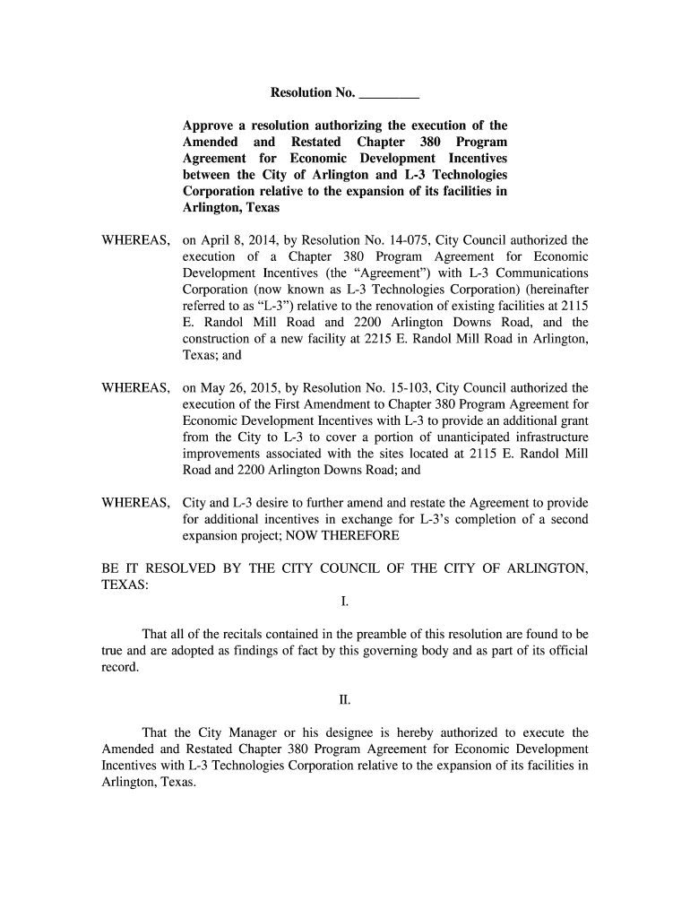 Resolution No. Approve a resolution authorizing the execution of the Amended and Restated Chapter 380 Program Agreement for Economic Development Incentives between the City of Arlington and L3 Technologies