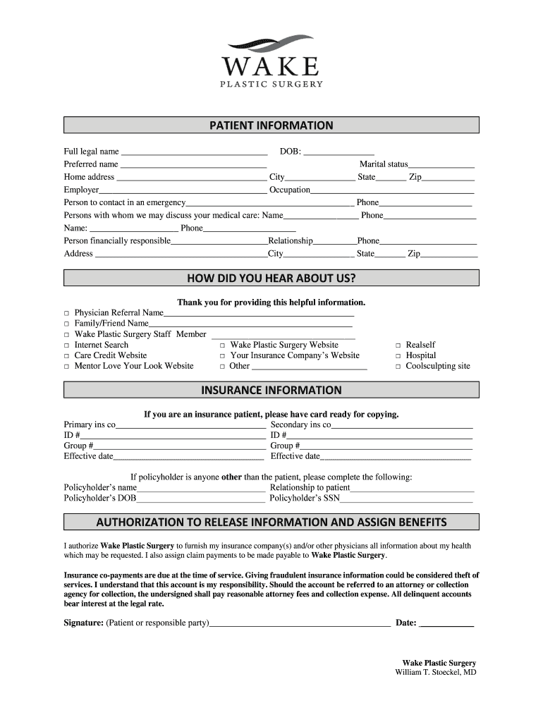 PATIENT INFORMATION Full legal name DOB: Preferred name Marital status Home address City State Zip Employer Occupation Person to contact in an emergency Phone Persons with whom we may discuss your