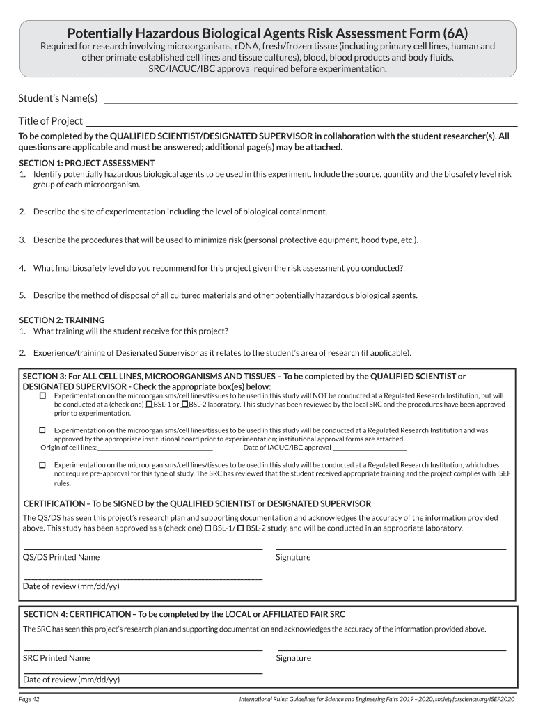 Potentially Hazardous Biological Agents Risk Assessment Form (6A)