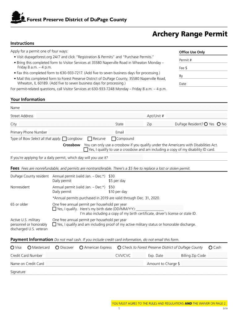 Archery Range Permit Instructions Apply for a permit one of four ways:Office Use Only Visit dupageforest.org 24/7 and click Registration & Permits and Purchase Permits. Bring this completed form to