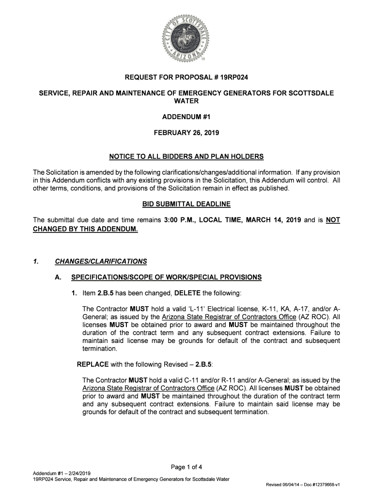 Get the free Addenda 1 Service and Maintenance of Emergency Generators for Scottsdale Water
