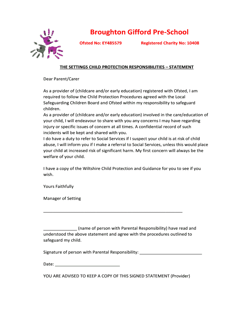 Brought on Gifford Preschool Ousted No: EY485579Registered Charity No: 10408THE SETTINGS CHILD PROTECTION RESPONSIBILITIES STATEMENT Dear Parent/Carer As a provider of (childcare and/or early education)