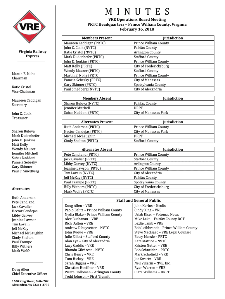 M I N U T E SURE Operations Board Meeting PRC Headquarters Prince William County, Virginia February 16, 2018Virginia Railway Express Martin E. None Chairman Katie Bristol ViceChairman Maureen Cardigan