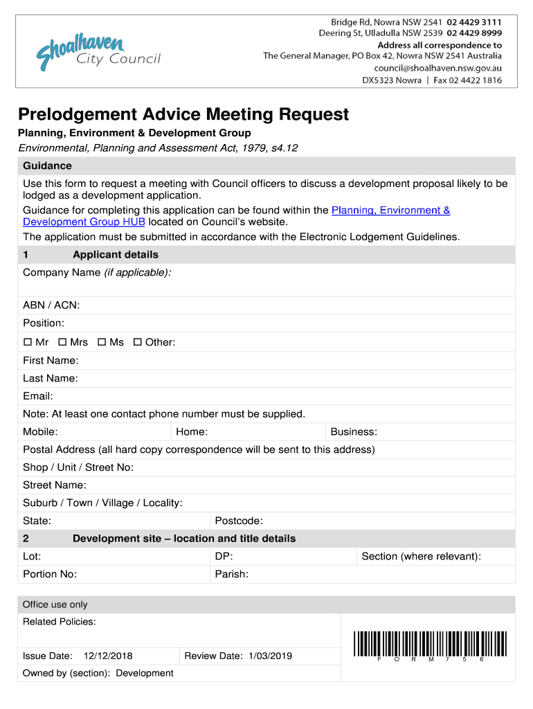 Prejudgment Advice Meeting Request Planning, Environment & Development Group Environmental, Planning and Assessment Act, 1979, s4.12 Guidance Use this form to request a meeting with Council officers