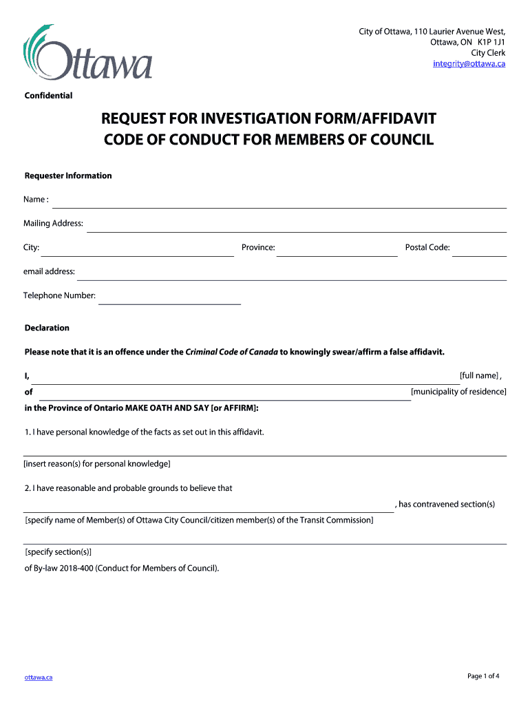 City of Ottawa, 110 Laurie Avenue West, Ottawa, ON K1P 1J1 City Clerk integrity Ottawa.ca ConfidentialREQUEST FOR INVESTIGATION FORM/AFFIDAVIT CODE OF CONDUCT FOR MEMBERS OF COUNCIL Requester Information