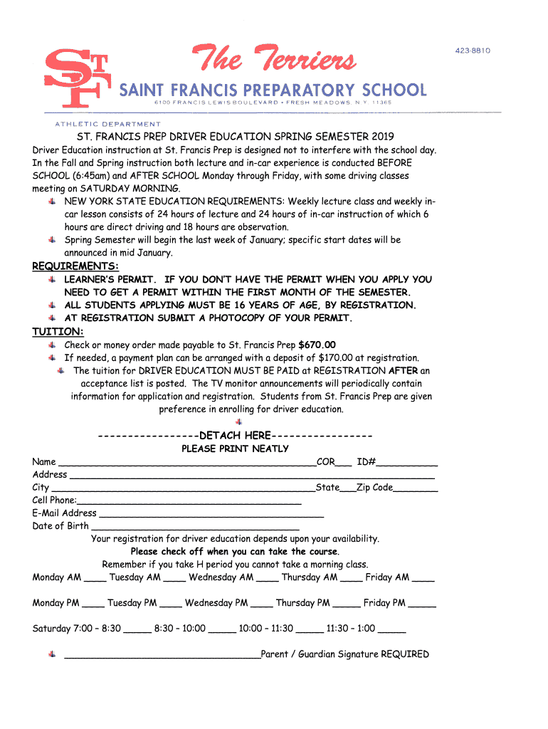 ST. FRANCIS PREP DRIVER EDUCATION SPRING SEMESTER 2019Driver Education instruction at St. Francis Prep is designed not to interfere with the school day.