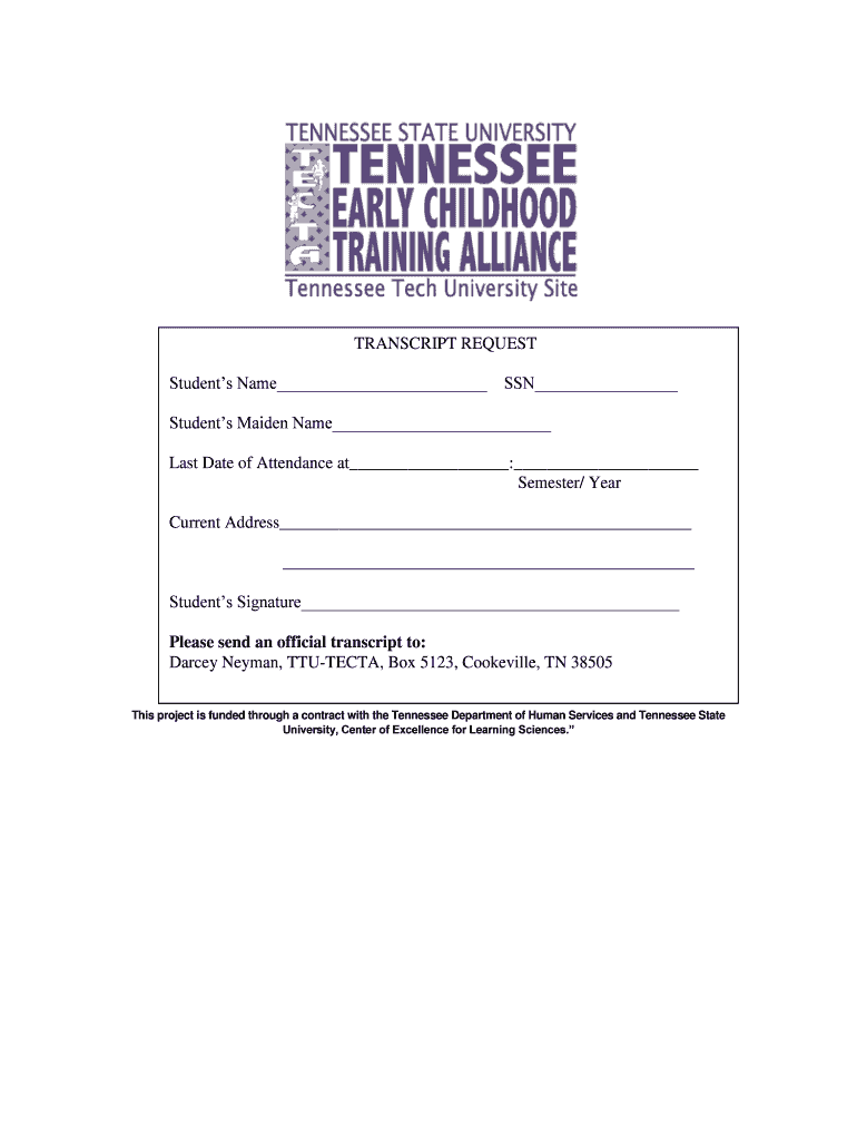 TRANSCRIPT REQUEST Students Name SSN Students Maiden Name Last Date of Attendance at : Semester/ Year Current Address Students Signature Please send an official transcript to: Darcy Newman, TAUTEST,