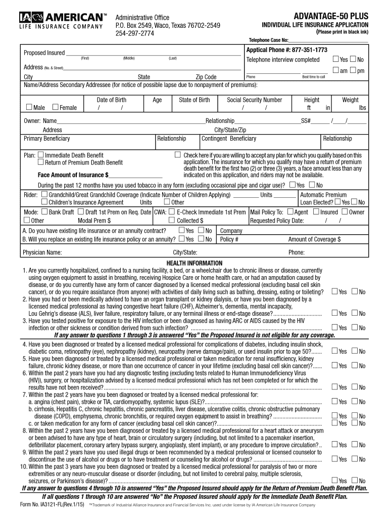ADVANTAGE50 PLUSAdministrative Office P.O. Box 2549, Waco, Texas 767022549 2542972774INDIVIDUAL LIFE INSURANCE APPLICATION (Please print in black ink)Telephone Case No: Proposed Insured Optical Phone