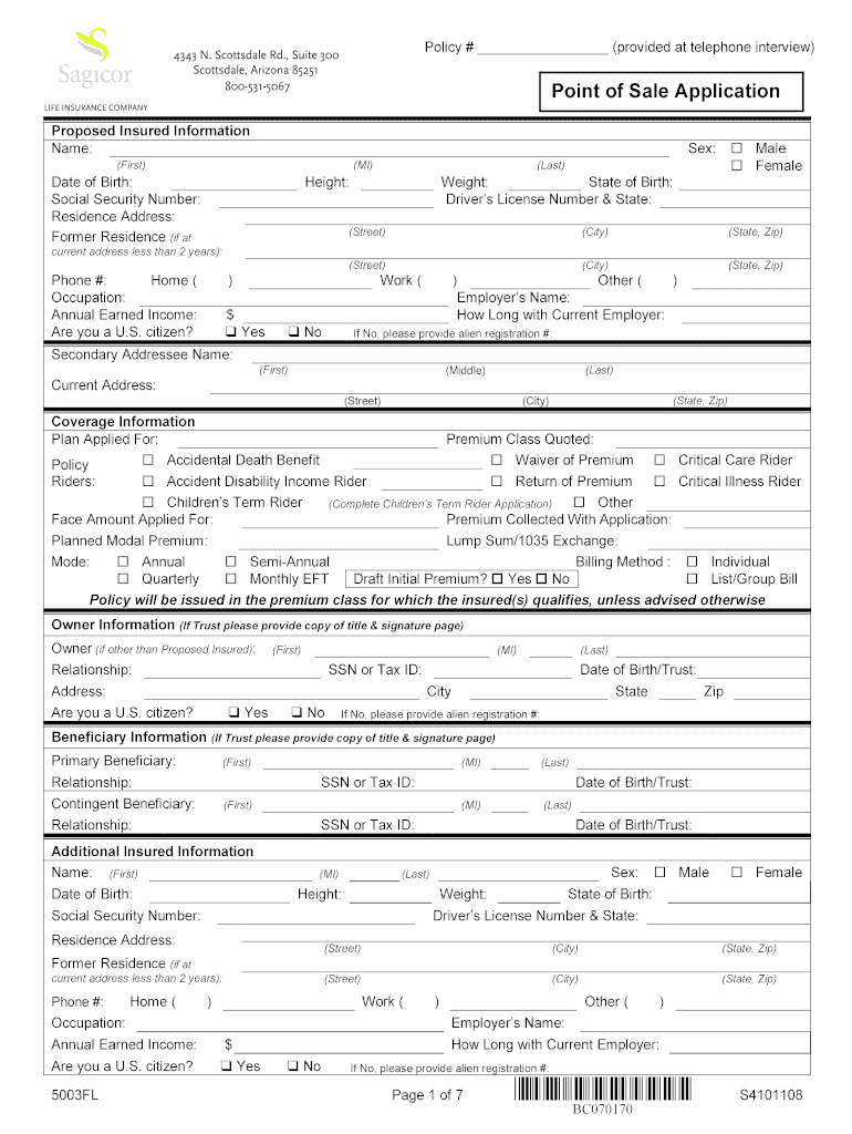 Policy # (provided at telephone interview)Point of Sale Application Proposed Insured Information Name: (First)Date of Birth: Social Security Number: Residence Address: Former Residence (if height:(MI)Sex:(Last)Weight: