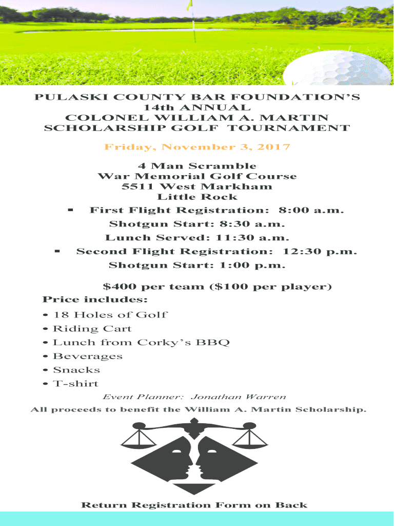 PULASKI COUNTY BAR FOUNDATIONS 14th ANNUAL COLONEL WILLIAM A. MARTIN SCHOLARSHIP GOLF TOURNAMENT Friday, November 3, 2017 4 Man Scramble War Memorial Golf Course 5511 West Markham Little Rock First