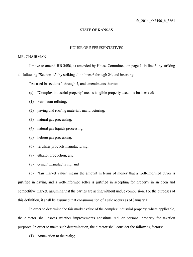 Fa 2014 hb2456 h 3661 STATE OF KANSAS HOUSE OF REPRESENTATIVES MR. CHAIRMAN: I move to amend HE 2456, as amended by House Committee, on page 1, in line 5, by striking all following “Section 1. “;