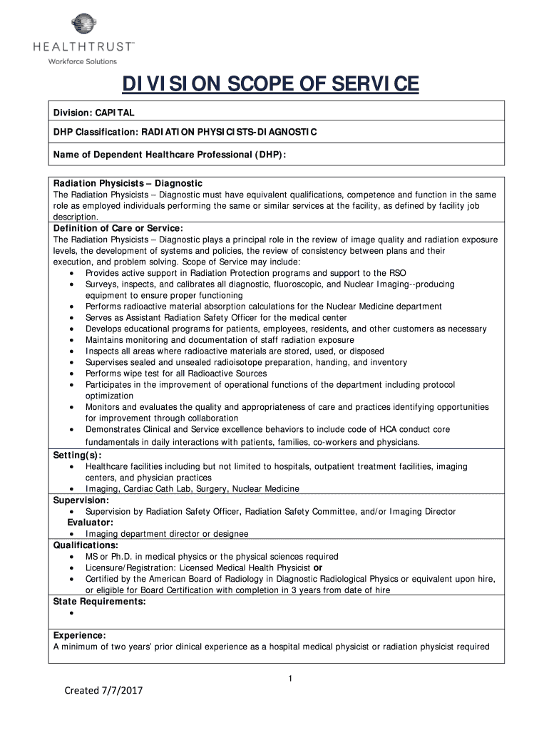 DIVISION SCOPE OF SERVICE Division: CAPITAL DHP Classification: RADIATION PHYSICISTSDIAGNOSTIC Name of Dependent Healthcare Professional (DHP): Radiation Physicists Diagnostic The Radiation Physicists