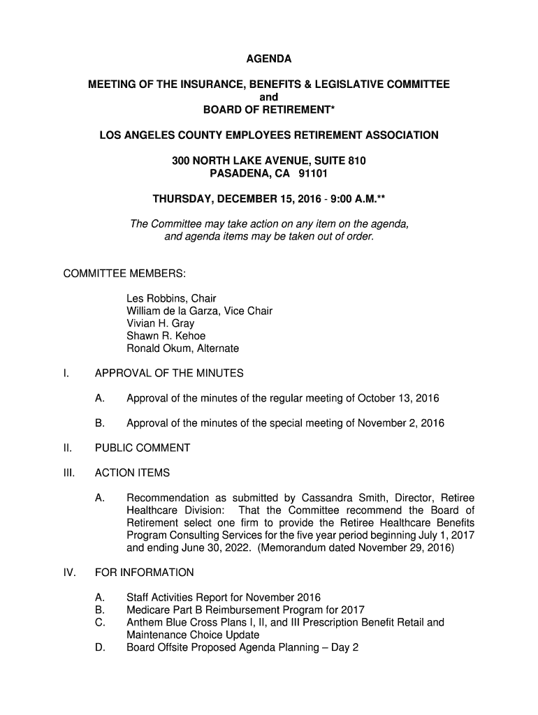 AGENDA MEETING OF THE INSURANCE, BENEFITS & LEGISLATIVE COMMITTEE and BOARD OF RETIREMENT* LOS ANGELES COUNTY EMPLOYEES RETIREMENT ASSOCIATION 300 NORTH LAKE AVENUE, SUITE 810 PASADENA, CA 91101 THURSDAY,