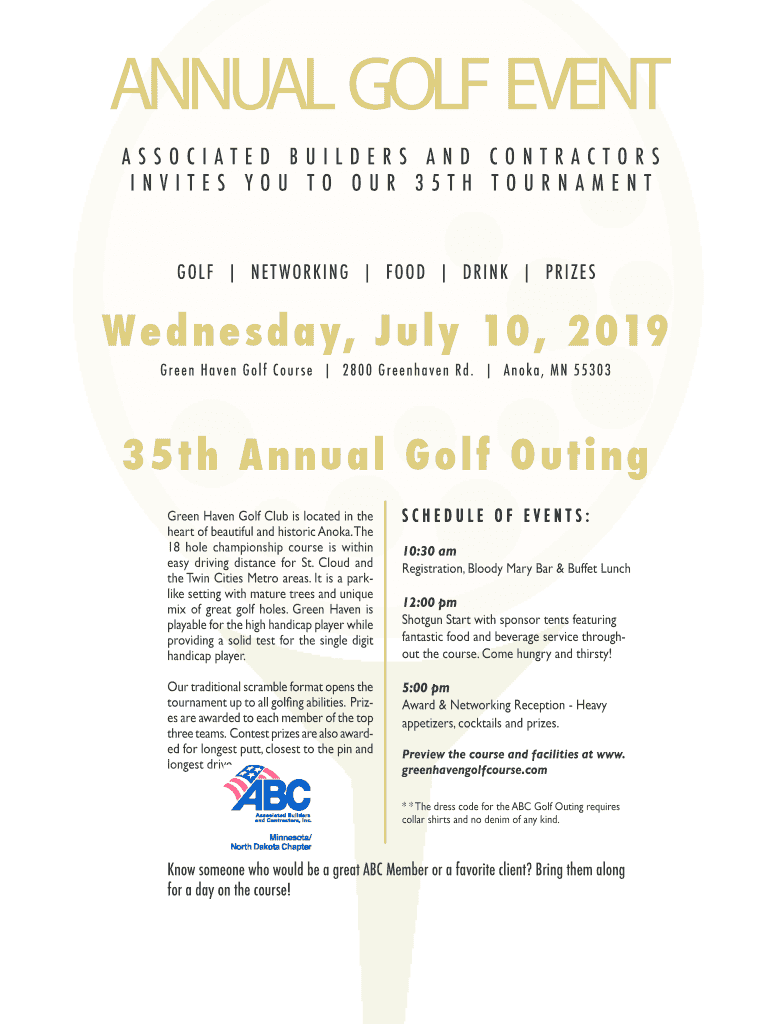 ANNUAL GOLF EVENT ASSOCIATED BUILDERS AND CONTRACTORS INVITES YOU TO OUR 35TH TOURNAMENTGOLF NET W WORKING F GOOD DRINK PRIZES end e s day, Jul y 10, 2019 Green Ha ve n Golf Four s e 2800 Gr Kenya