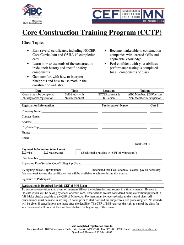 Core Construction Training Program (CCTP) Class Topics Earn several certificates, including NICER Core Curriculum and OSHA 10 completion card Learn how to use tools of the construction trade, their